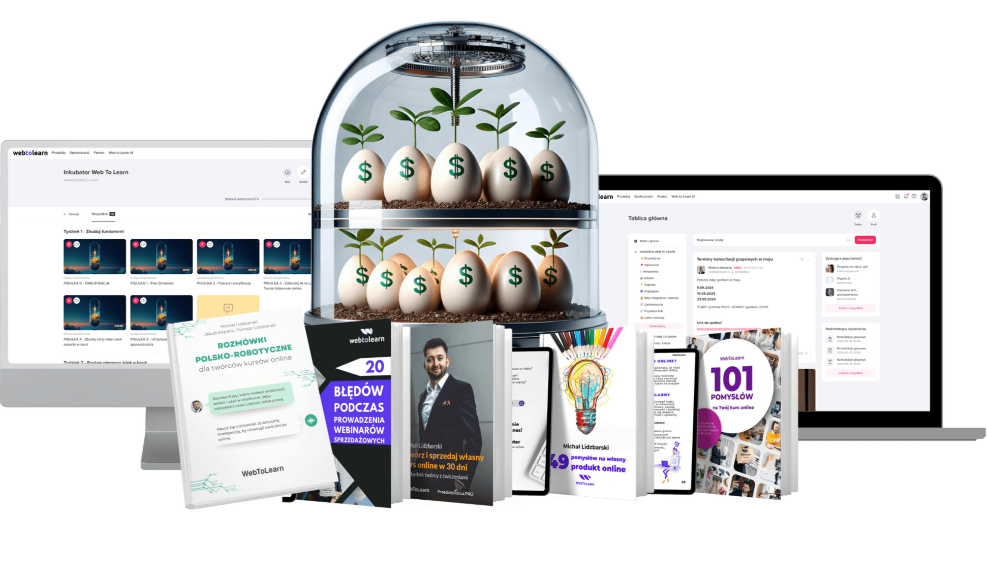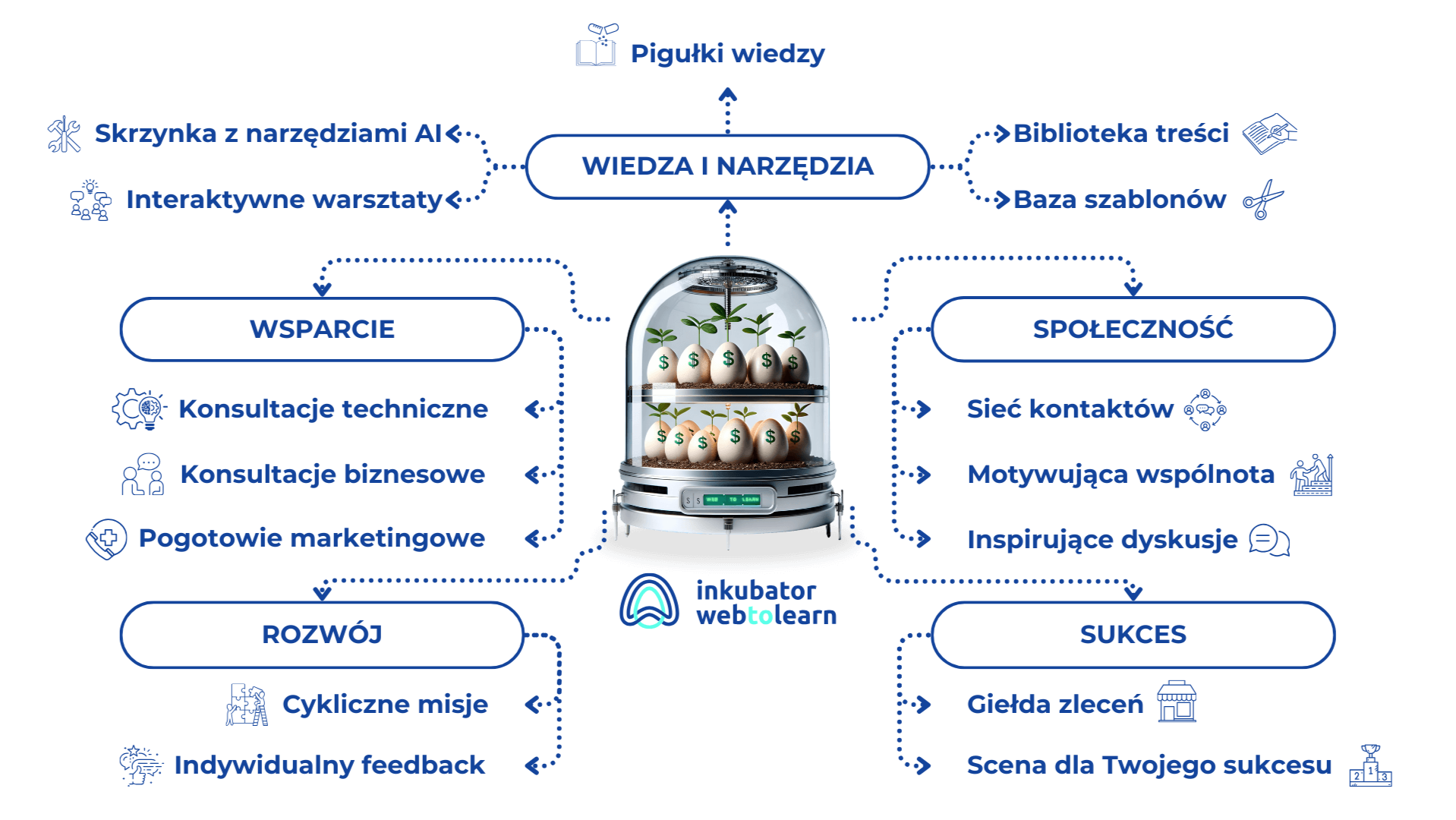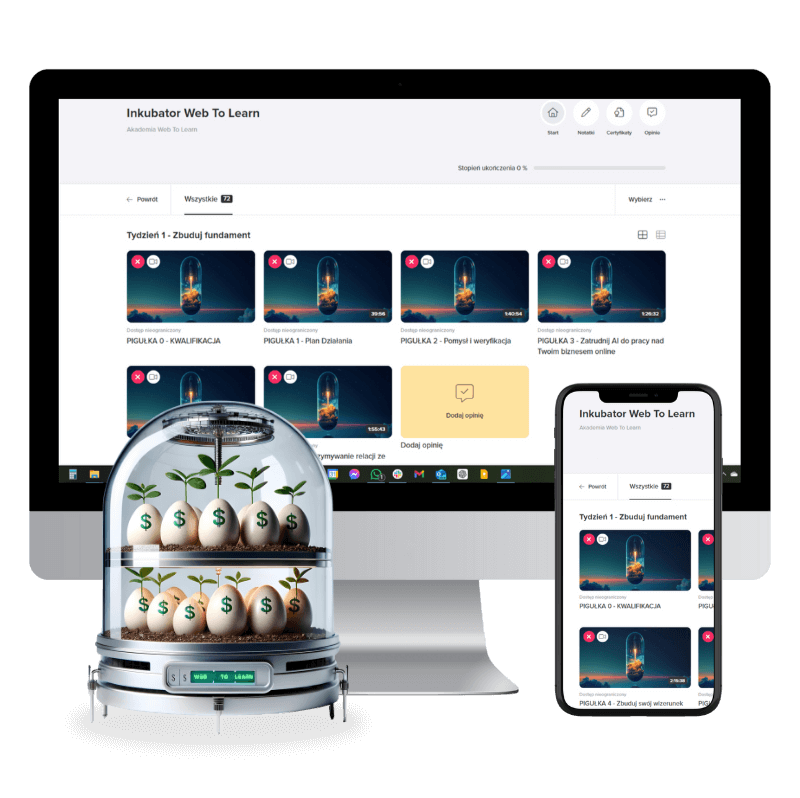 Inkubator wraz z przestrzenią dla społeczności oraz wszystkimi zasobami zlokalizowany jest na wygodnej, zewnętrznej platformie szkoleniowej Web To Learn, do której otrzymasz dostęp tuż po dołączeniu do programu.