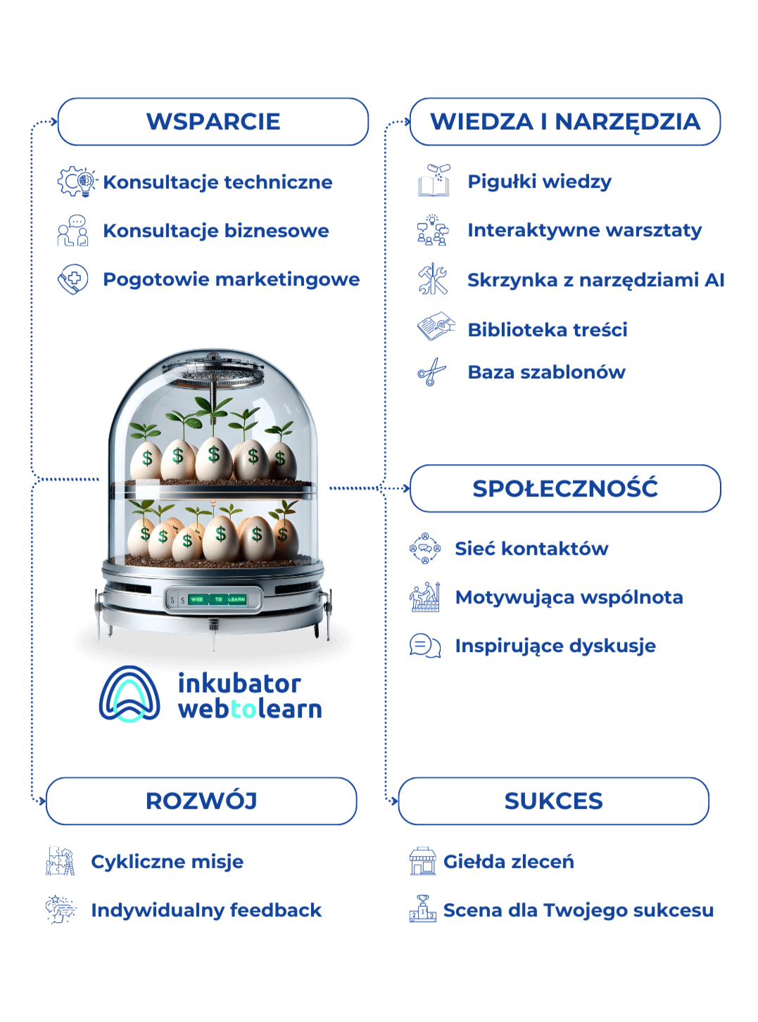 Inkubator Web To Learn to nie kolejny kurs o tym, jak sprzedawać więcej i szybciej.Nie damy Ci kury znoszącej złote jaja, bo w prawdziwym biznesie online nie ma miejsca na legendy.Inkubator to innowacyjne połączenie cyklicznego programu szkoleniowego oraz społeczności dla kreatywnych twórców i przedsiębiorców.Oferujemy wsparcie społeczności, regularny mentoring w gronie ekspertów marketingu, sprawdzoną wiedzę, narzędzia oraz rozwiązania, które odpowiadają na szereg problemów, z którymi mierzą się cyfrowi przedsiębiorcy.